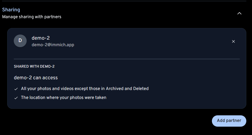 Immich allows you to share your library with other users. They can then view your library and download the assets. You can manage Partner Sharing from the User Settings page on the web.